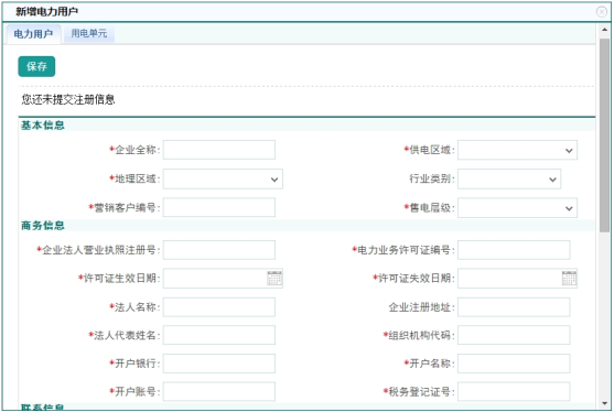 在新建用戶頁面包括兩個(gè)標(biāo)簽頁,需要首先在第一個(gè)標(biāo)簽頁可以填寫用戶信息,然后在第二個(gè)標(biāo)簽頁增加此用戶所包含的用電單元信息,一個(gè)用戶可以創(chuàng)建多個(gè)用電單元。